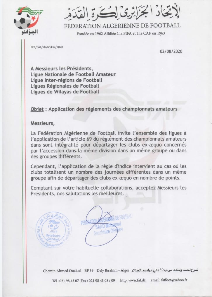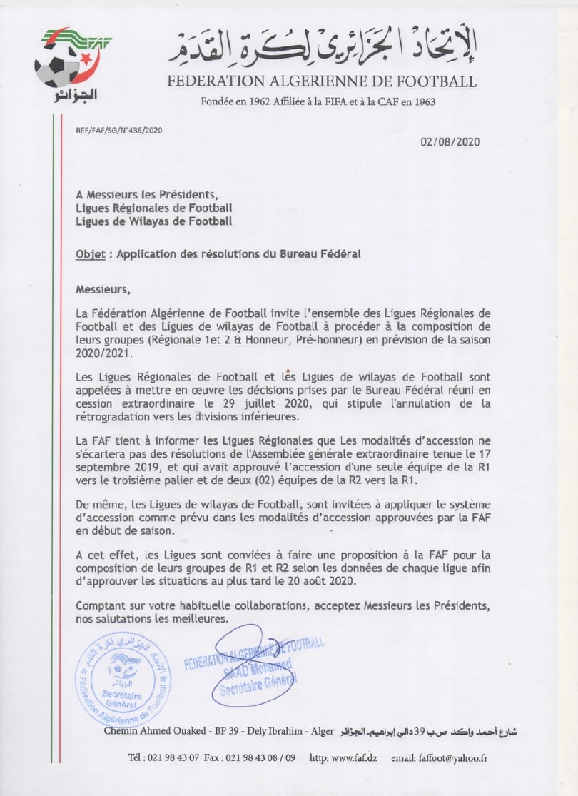 مراسلة الإتحاد الجزائري لكرة القدم رقم REF/FAF/SG/N436/2020 و REF/FAF/SG/N437/2020 بتاريخ 2020/08/02