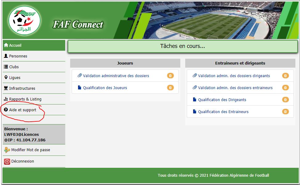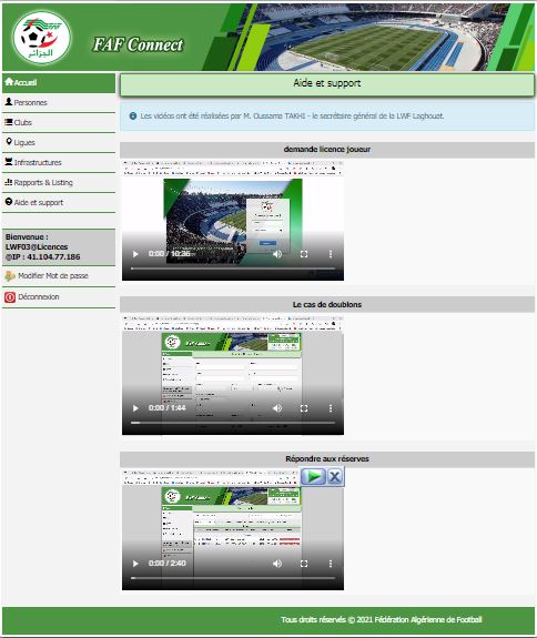 للإطلاع على طريقة تأهيل اللاعبين ستجدون في منصة التأهيل FAF CONNECT تبويبة تحت اسم Aide et Support كما هو موضح في الصور بالأسفل تحتوي على فيديوات لشرح العملية بالتفصيل