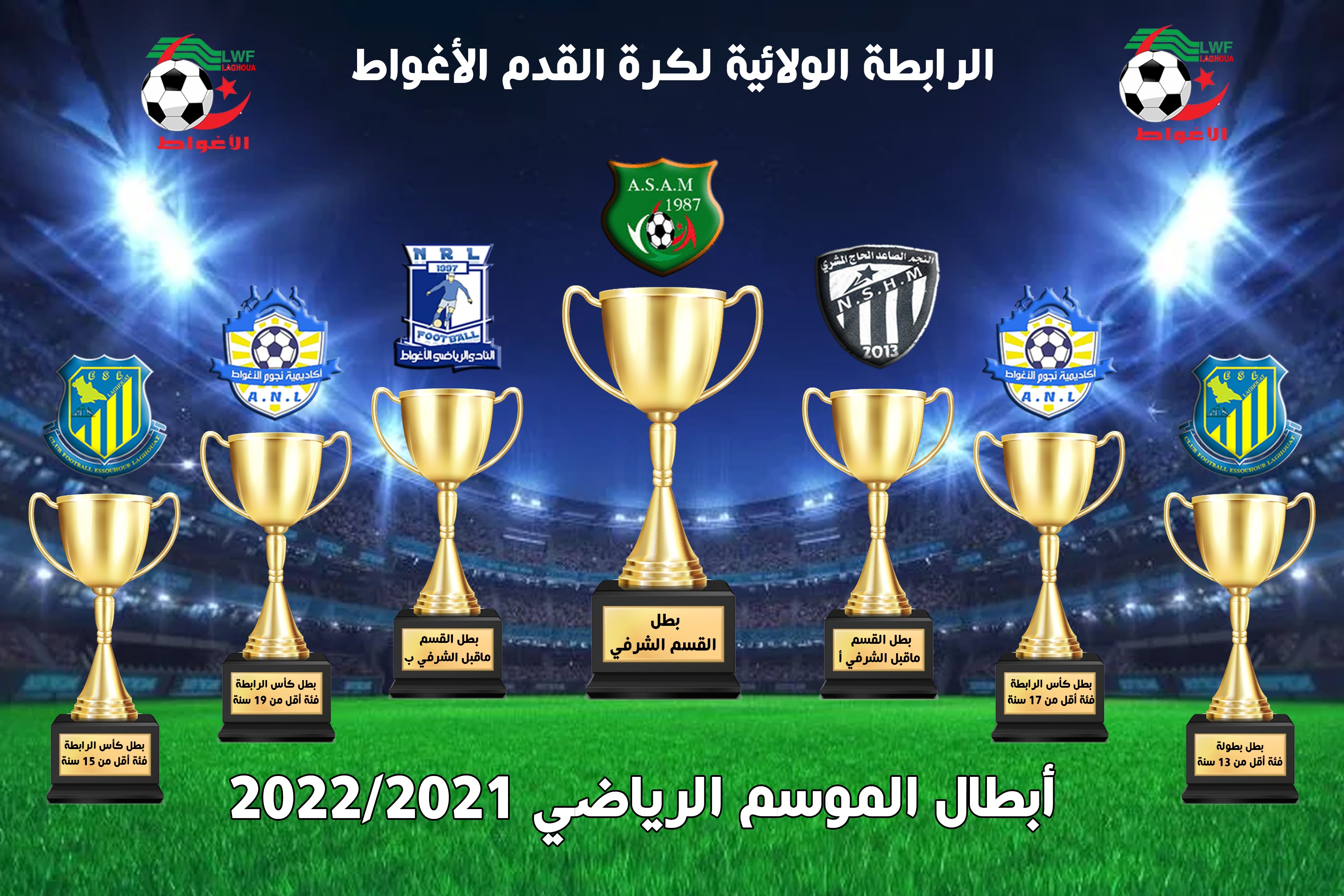 بمناسبة اختتام الموسم الرياضي 2022/2021 يتقدم رئيس الرابطة الولائية لكرة القدم لولاية الأغواط السيد أحمد خرشي أصالة عن نفسه ونيابة عن أعضاء الرابطة وإدارييها بأحر التهاني وازكى التبريكات للفرق البطلة لهذا الموسم :