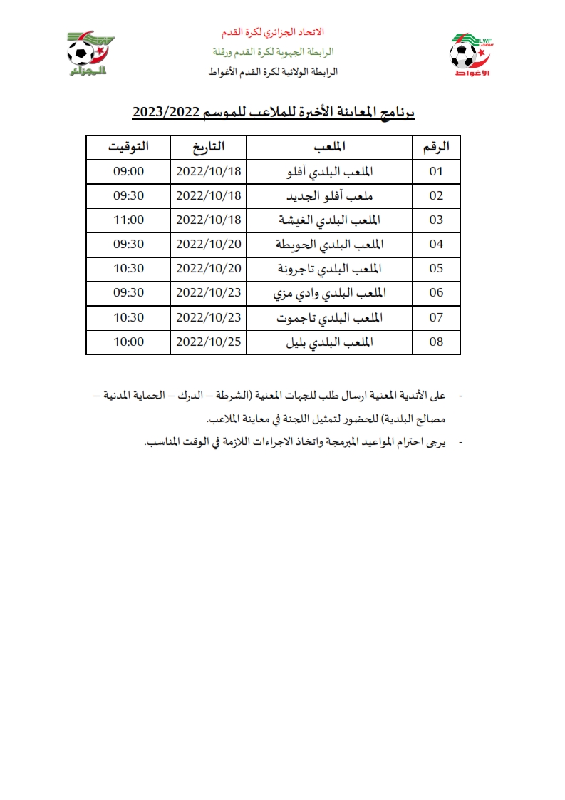 على الأندية المعنية ارسال طلب للجهات المعنية (الشرطة – الدرك – الحماية المدنية – مصالح البلدية) للحضور لتمثيل اللجنة في معاينة الملاعب.
