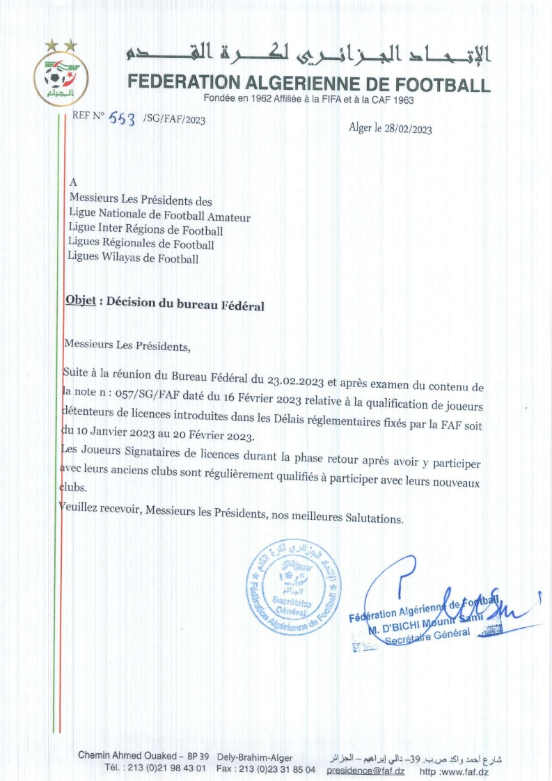 بناءً على المراسلة الواردة من الاتحاد الجزائري لكرة القدم فإن اللاعب الذي لعب في ناديه الأصلي في مرحلة الإياب وأمضى في نادي آخر، يمكنه اللعب في ناديه الجديد