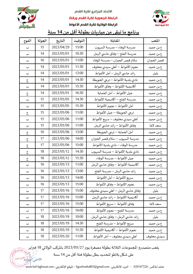 برنامج ما تبقى من مباريات بطولة أقل من 14 سنة