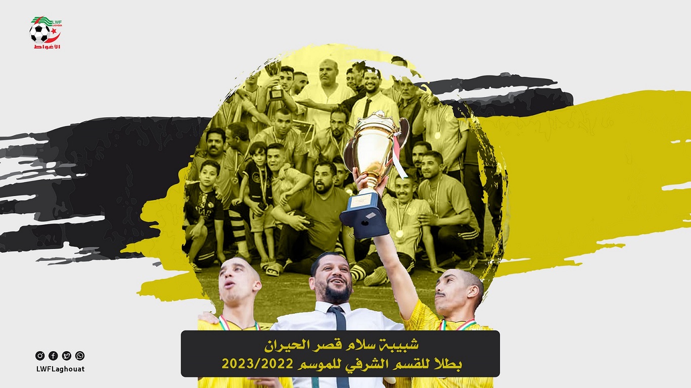 بمناسبة تتويج فريق شبيبة سلام قصر الحيران ببطولة القسم الشرفي للموسم 2023/2022 وصعوده للقسم الجهوي الثاني لرابطة الجنوب الشرفي ورقلة، يتقدم رئيس الرابطة السيد أحمد خرشي أصالةً عن نفسه ونيابة عن المكتب التنفيذي للرابطة والأسرة الرياضية بأحر التهاني لفريق JSKH على هذا التتويج المستحق الذي جاء نتاج عمل ومجهود كبير طيلة الموسم وبإمكانيات مادية قليلة جداً خاصة وأن الفريق يملك كل الفئات السنية.