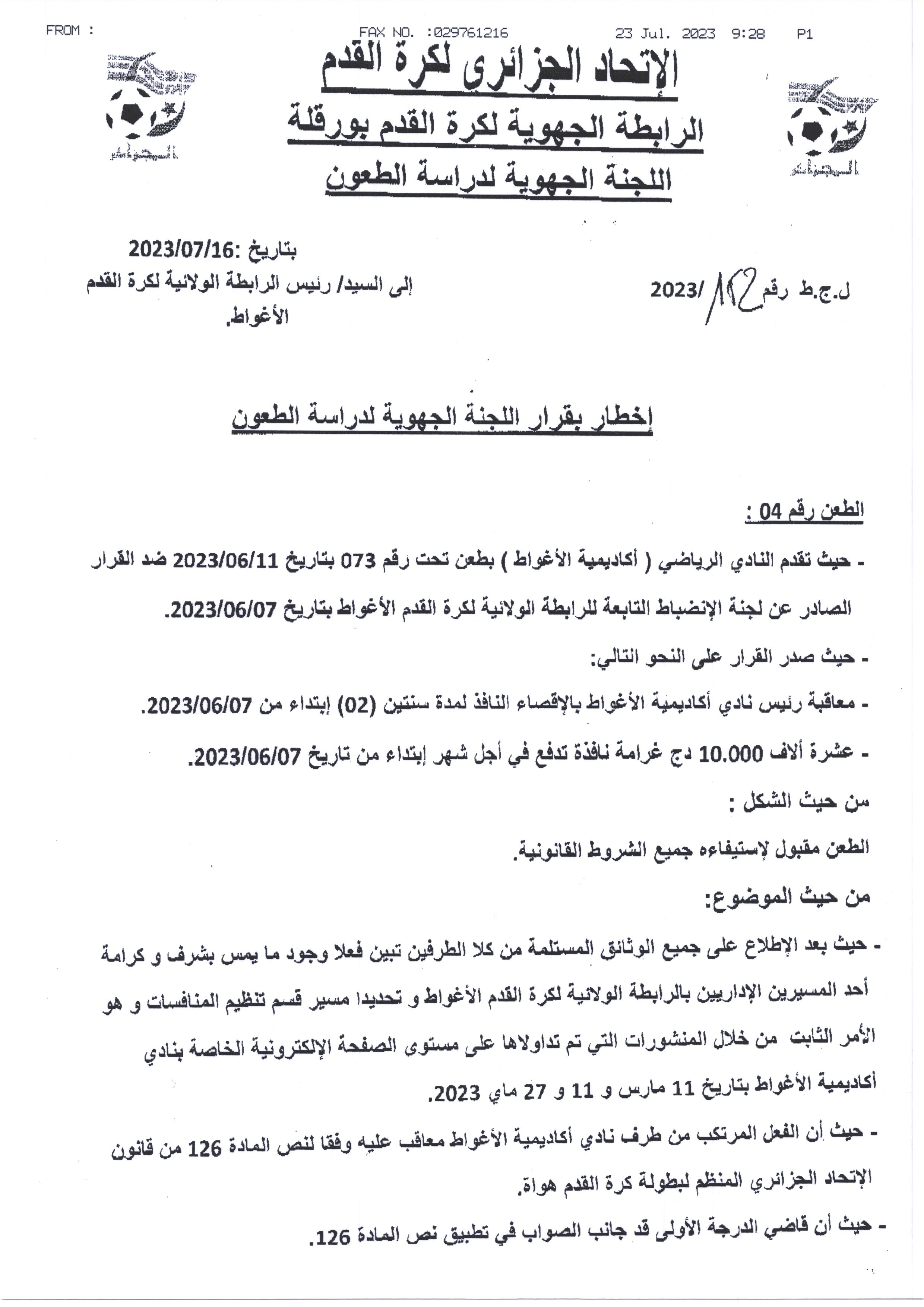 اللجنة الجهوية لدراسة الطعون للرابطة الجهوية لكرة القدم ورقلة تؤيد القرار الصادر عن لجنة الانضباط للرابطة الولائية لكرة القدم الأغواط بتاريخ 2023/06/07 مع تعديله بجعل عقوبة رئيس أكاديمية آفلو سنتين (02) منها 18 شهراً موقوفة النفاذ ابتداءً من تاريخ 2023/06/07.