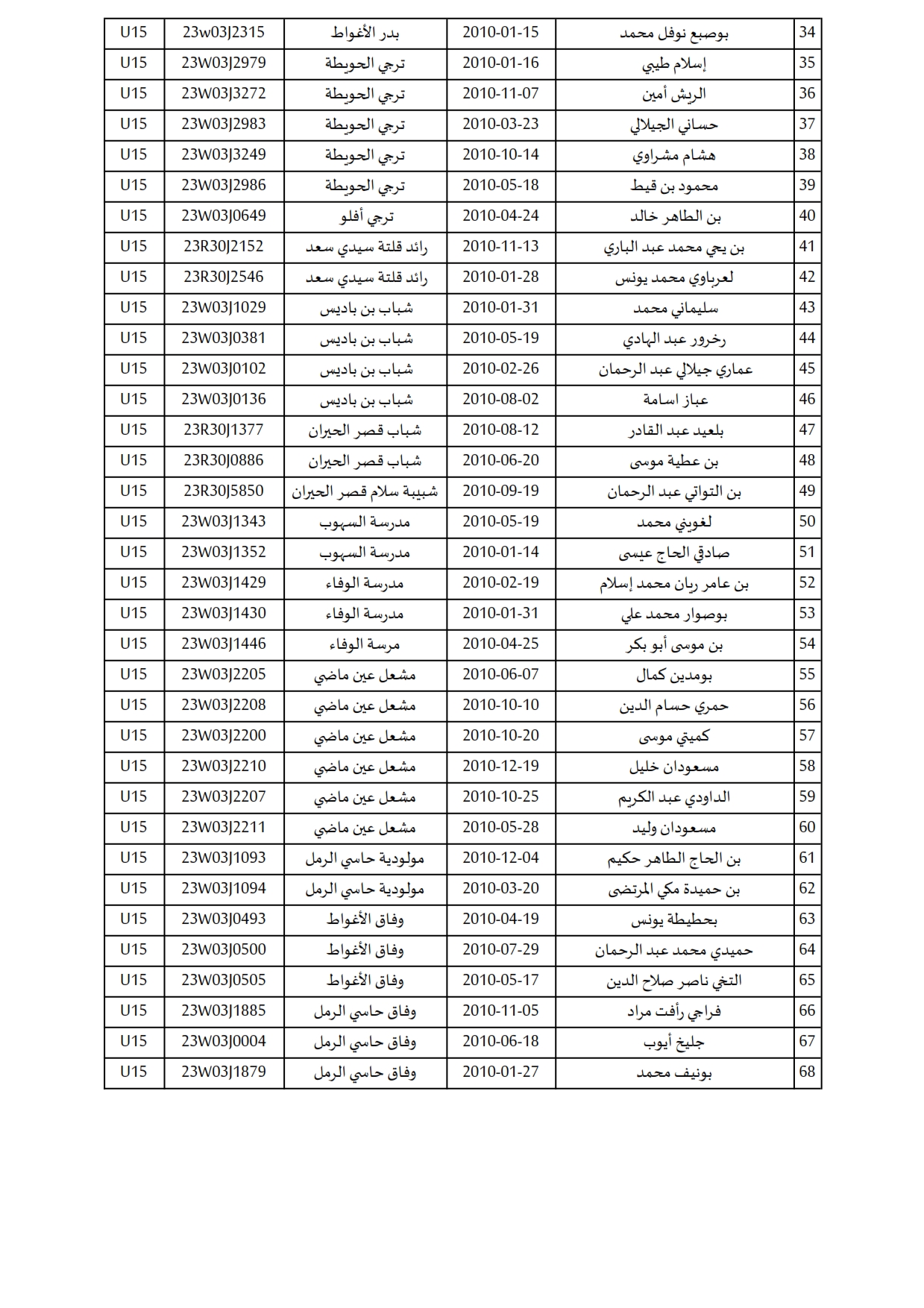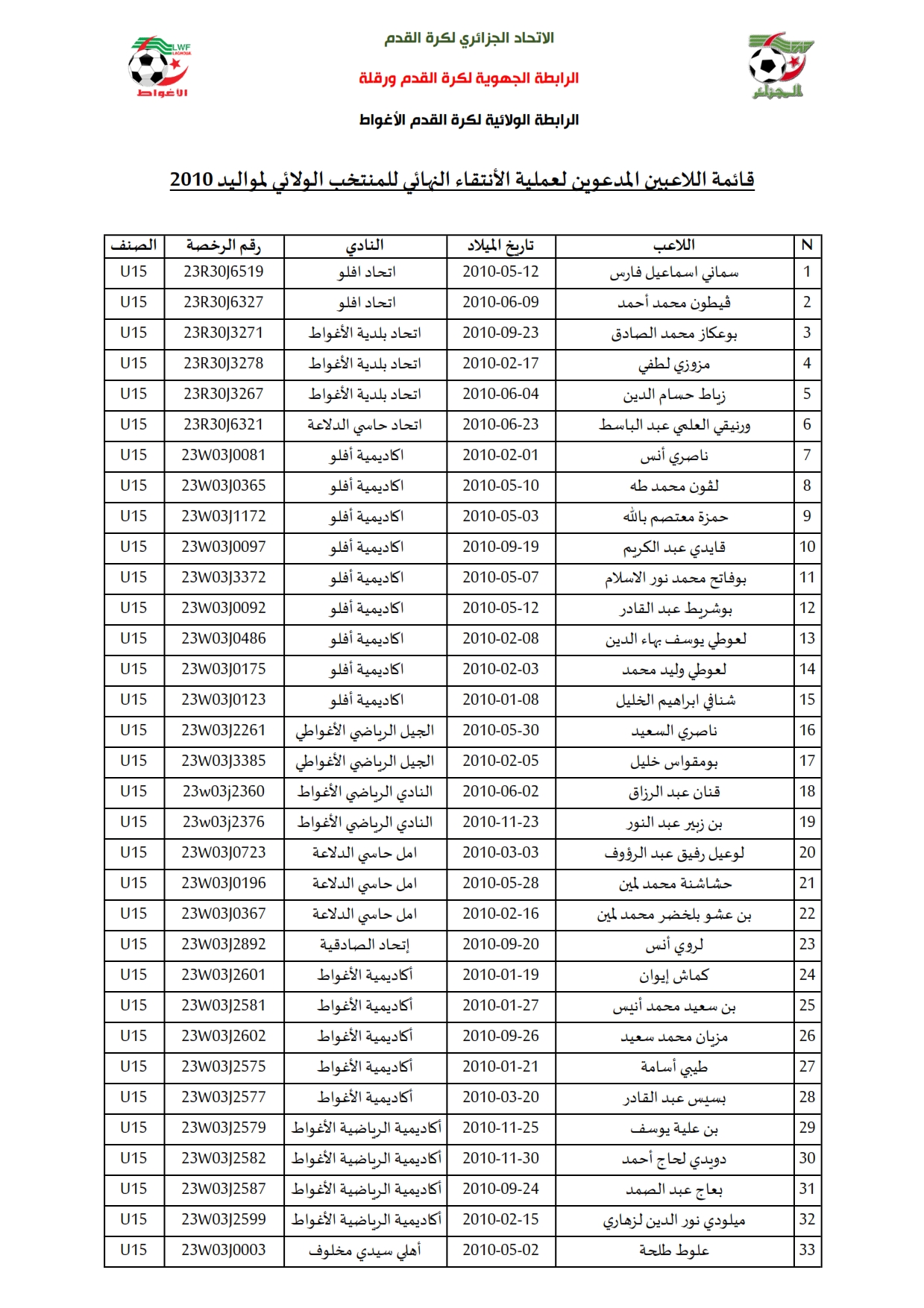 تدعو المديرية الفنية للرابطة الولائية لكرة القدم الأغواط اللاعبين المذكورين في القائمة بالأسفل للحضور يوم 2024/03/02 بالملعب البلدي عبد القادر بن حميد بدايةً من الساعة 08:00 صباحاً لإجراء عملية الإنتقاء النهائي للمنتخب الولائي لمواليد 2010.