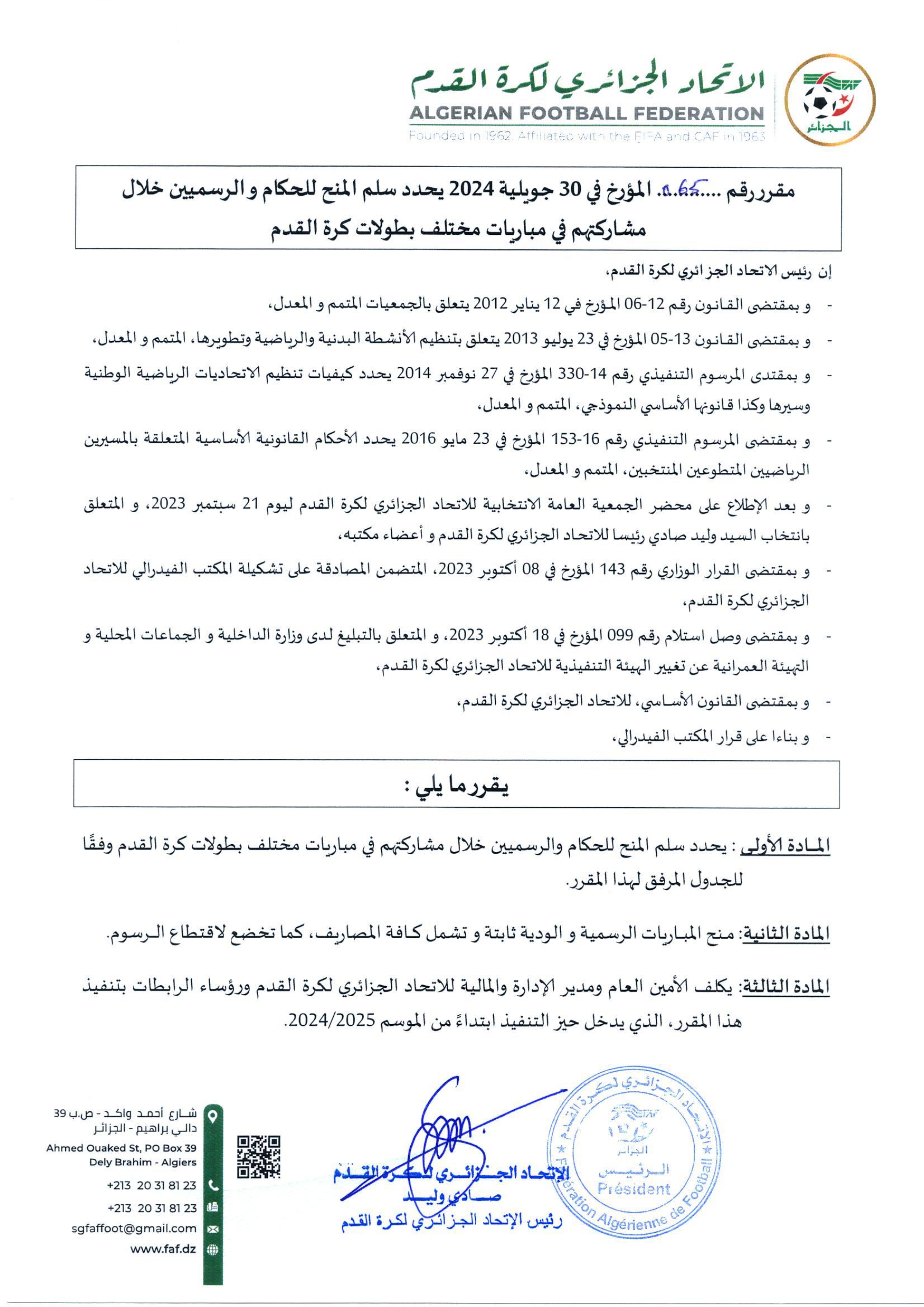 يتعلق بتحديد سُلّم مِنح الحكام ومراقبي الحكام ومحافظي المباريات لمختلف البطولات