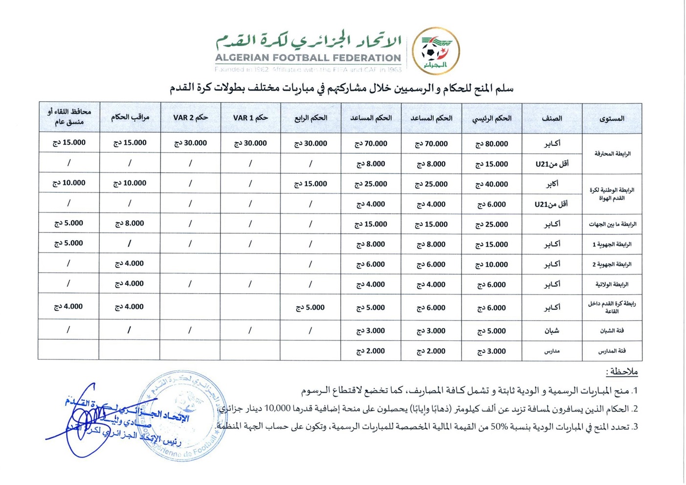الفئات الشبانية : الحكم الرئيسي 5000 دج - الحكم المساعد 3000 دج