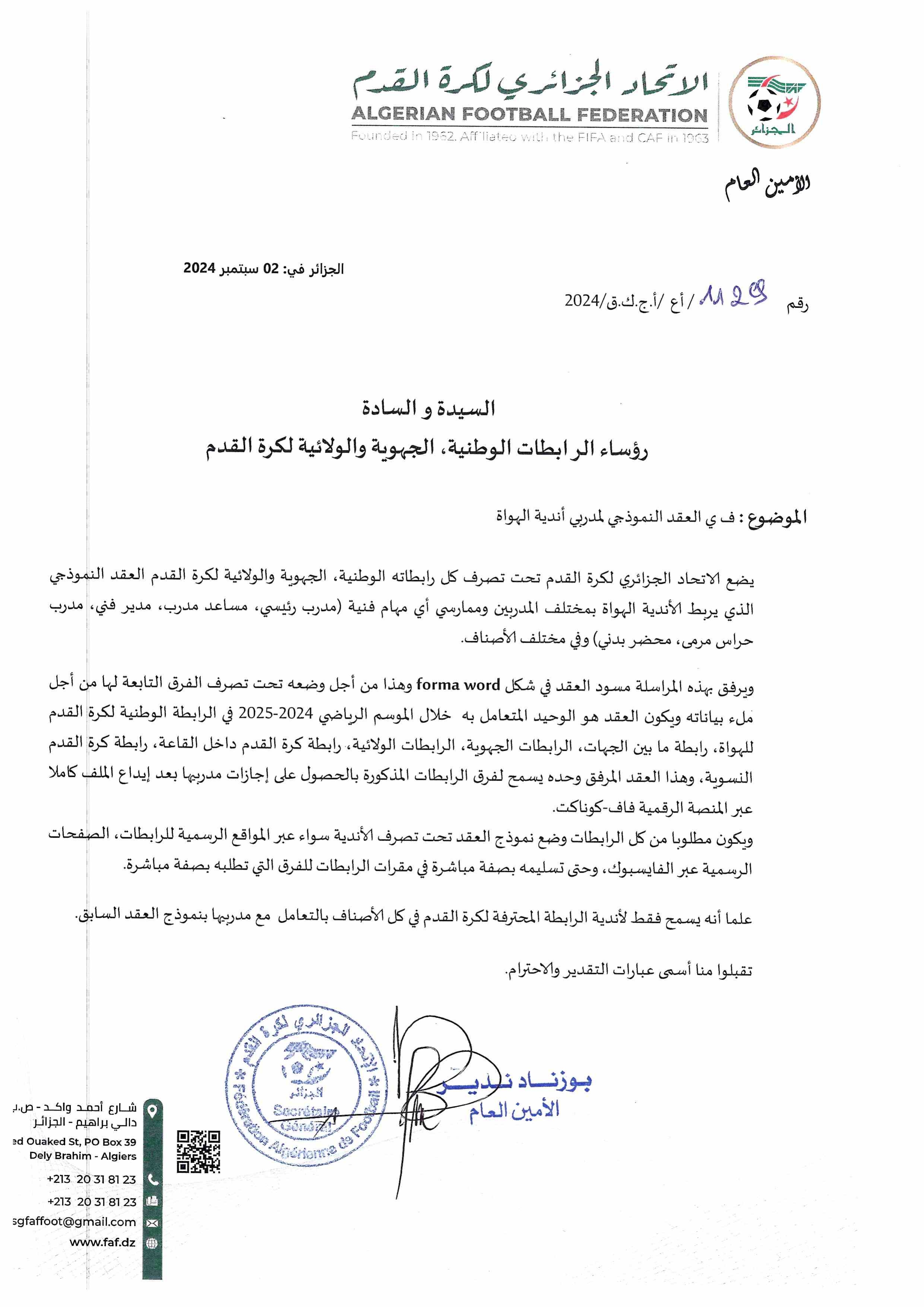 بناءً على مراسلة الاتحاد الجزائري لكرة القدم على النوادي الهواة الإلتزام بنموذج عقد المدرب المرفق