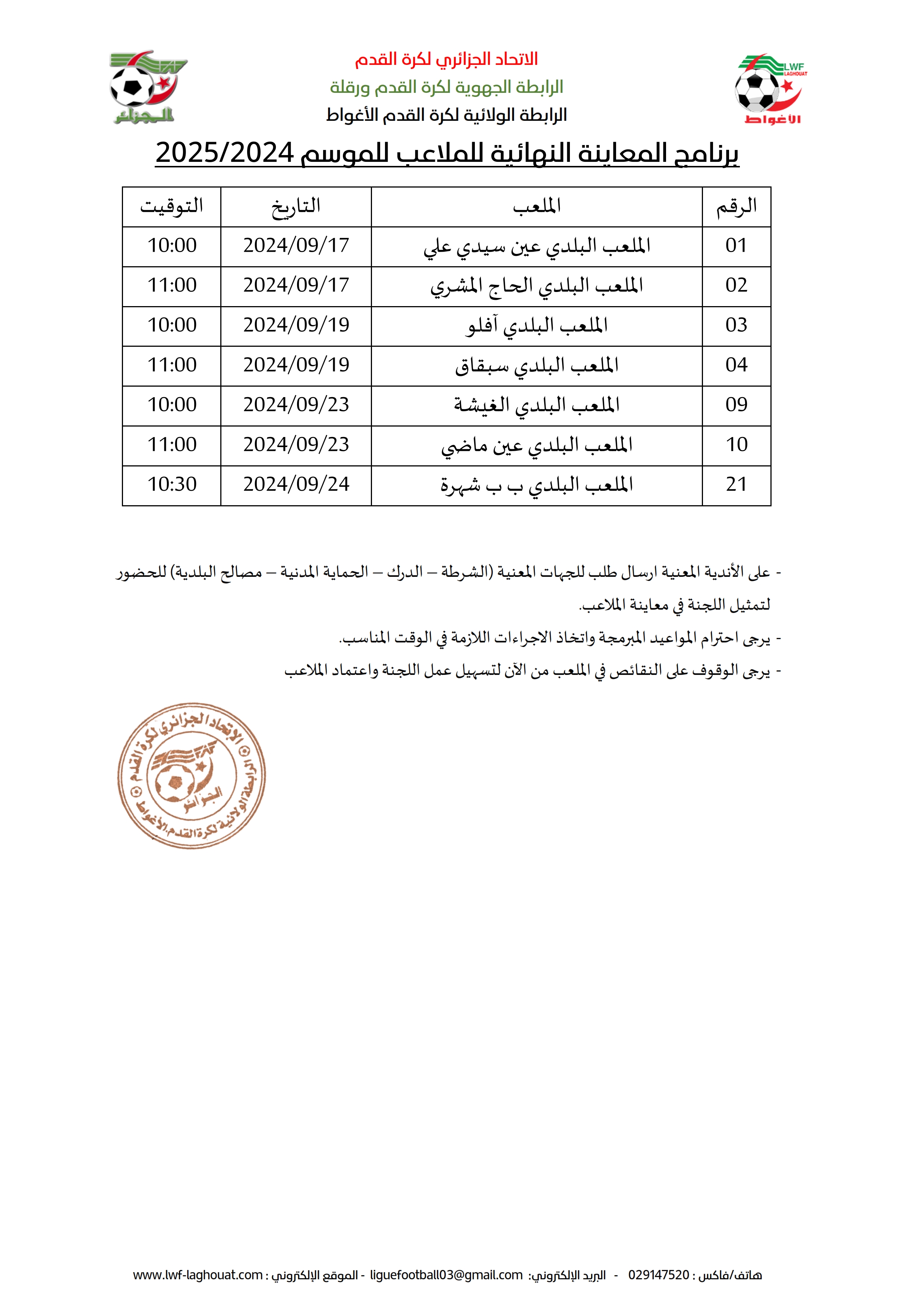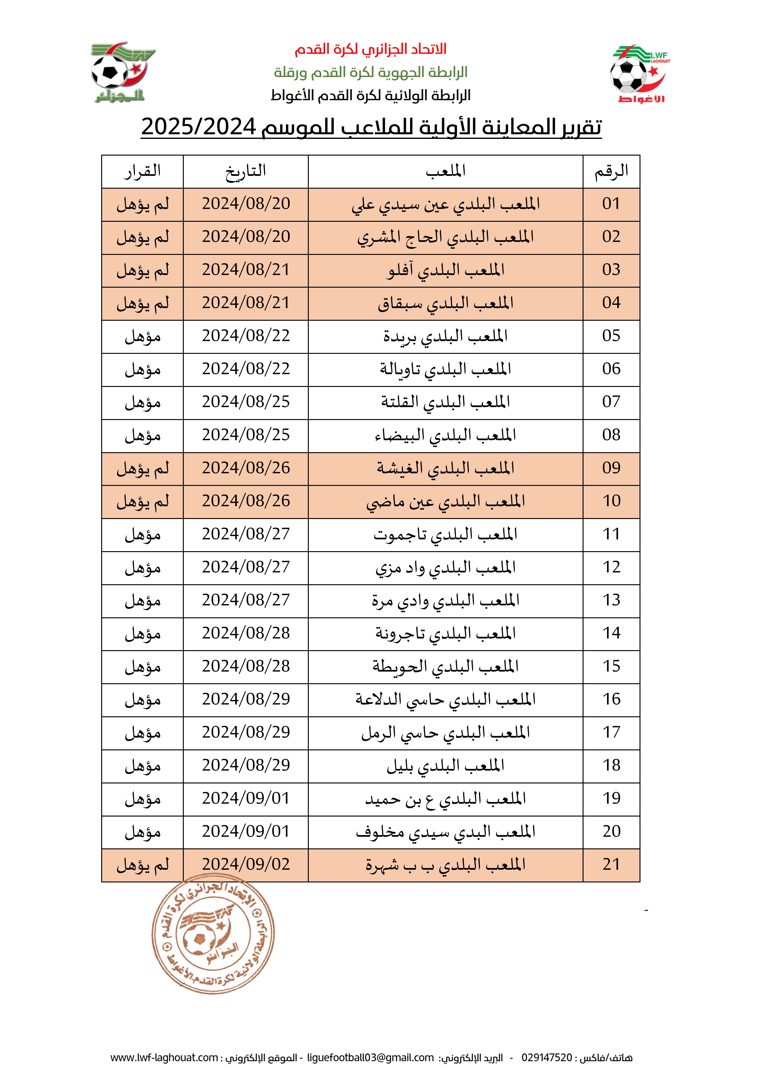 لضمان انطلاقة جيدة للموسم الرياضي زارت لجنة تأهيل الملاعب 21 ملعباً تم تأهيل منها 14 ملعباً بينما تم تسجيل تحفظات على 07 ملاعب والتي ستكون للجنة زيارة أخيرة لها لمعاينتها كما هو مبين في الجدول بالأسفل.