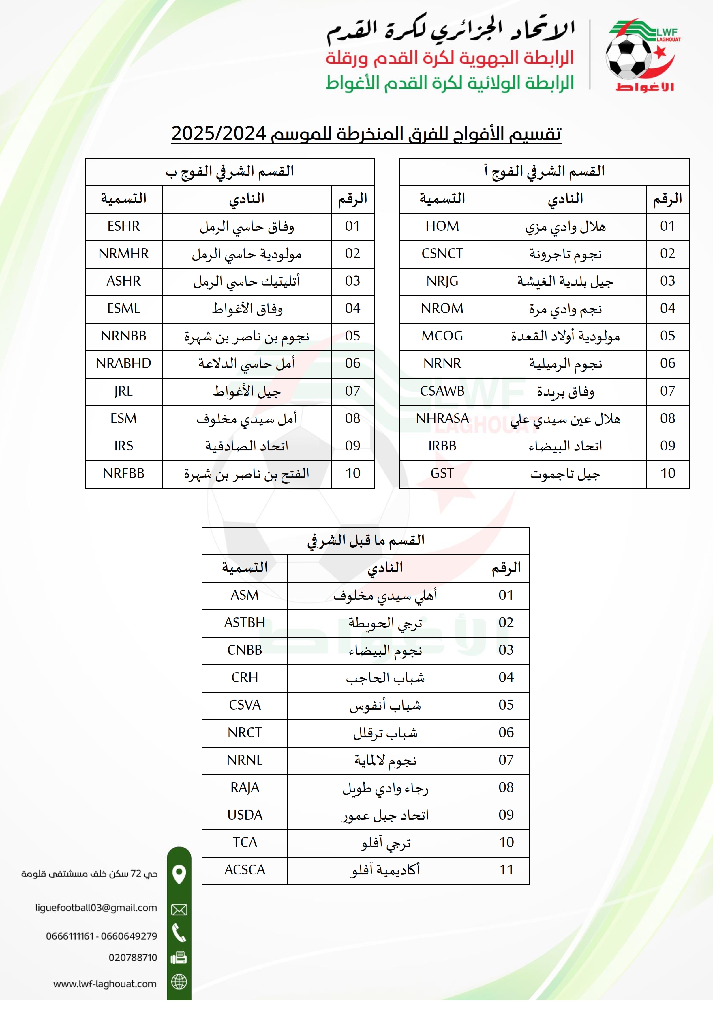 - بعد انقضاء الآجال القانونية لانخراط النوادي المبرمجة من الاتحاد الجزائري لكرة القدم - وبناءً على المادة 01 من لوائح بطولات كرة القدم هواة (الإصدار 2024) فإنه تم تقسيم الأفواج للقسمين الشرفي وما قبل الشرفي كالآتي :