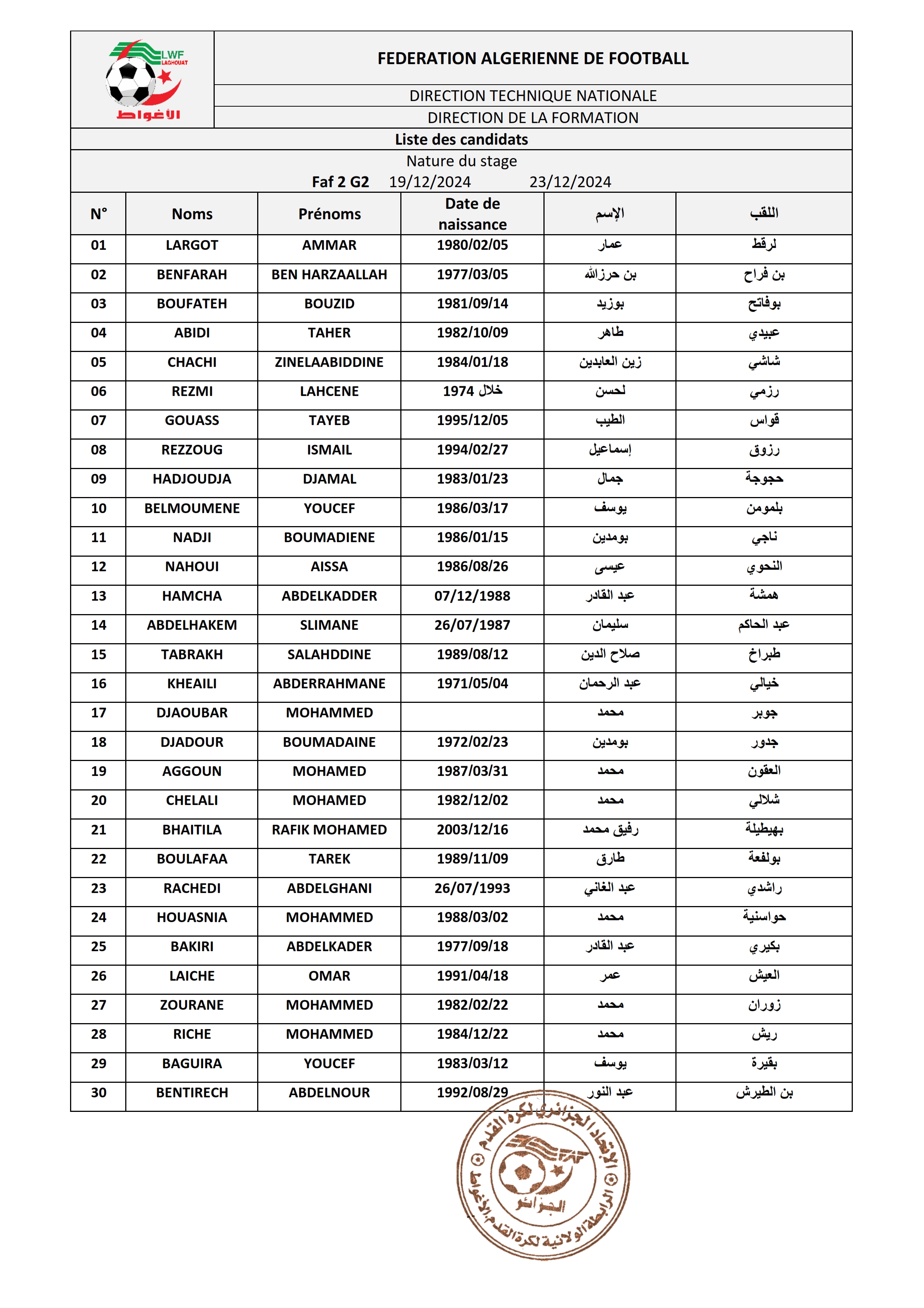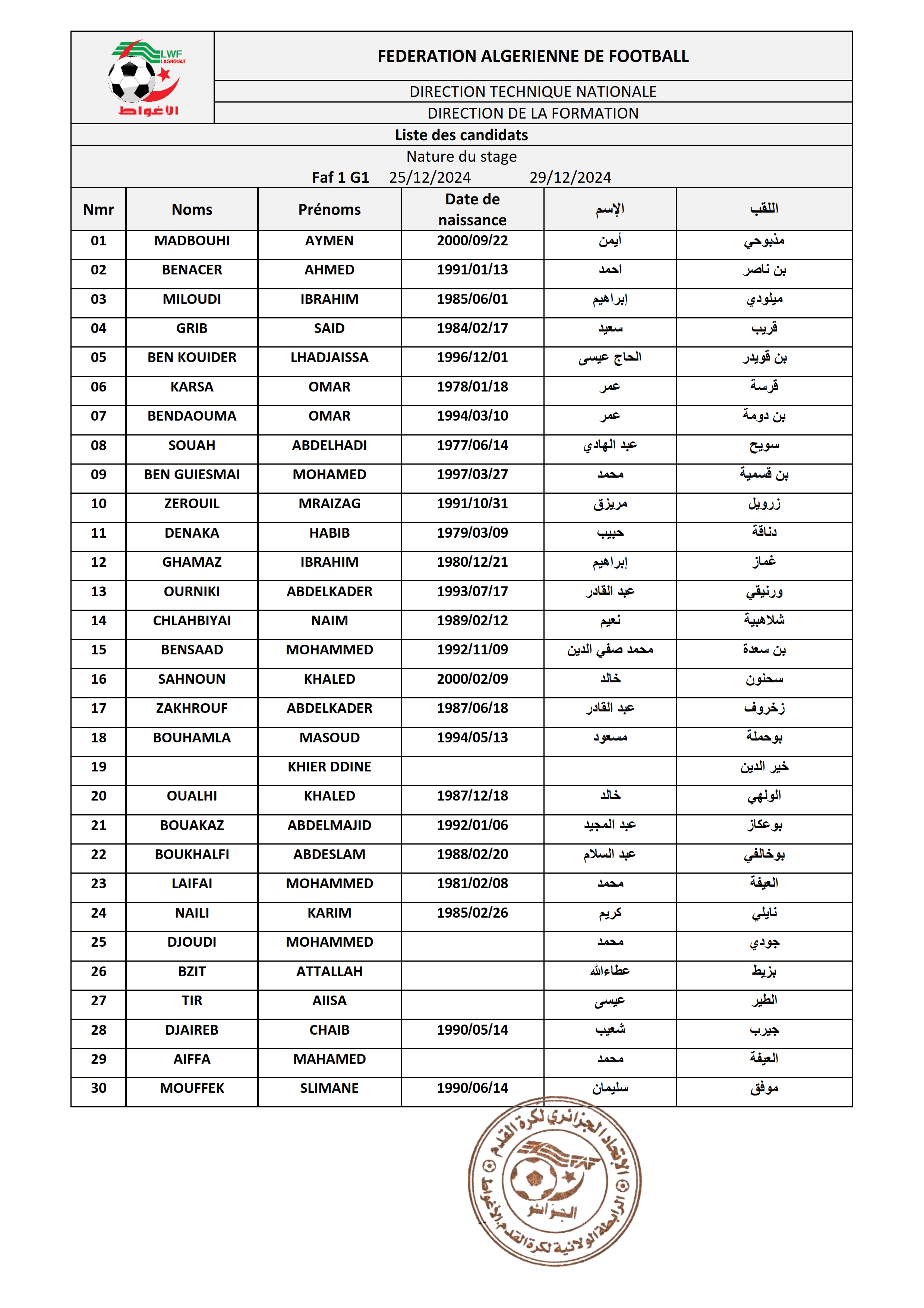 ينطلق تربص المدربين FAF1 يوم 25 إلى غاية 29 ديسمبر 2024