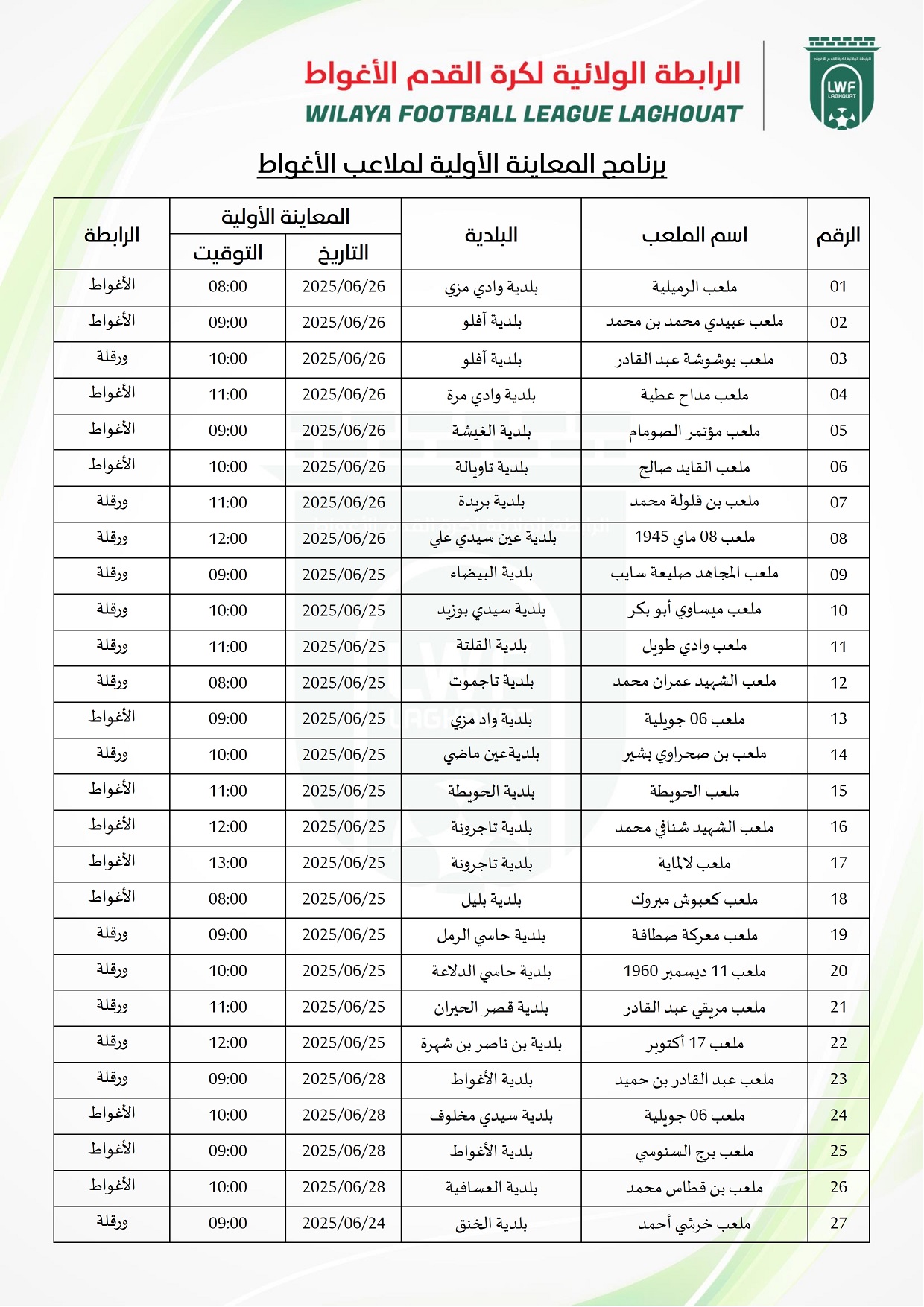 تعلن لجنة تعيين الملاعب للرابطة الولائية لكرة القدم بالأغواط عن برنامج المعاينة الأولية للملاعب للموسم 2026/2025 وفق الجدول بالأسفل وعليه المطلوب من النوادي :