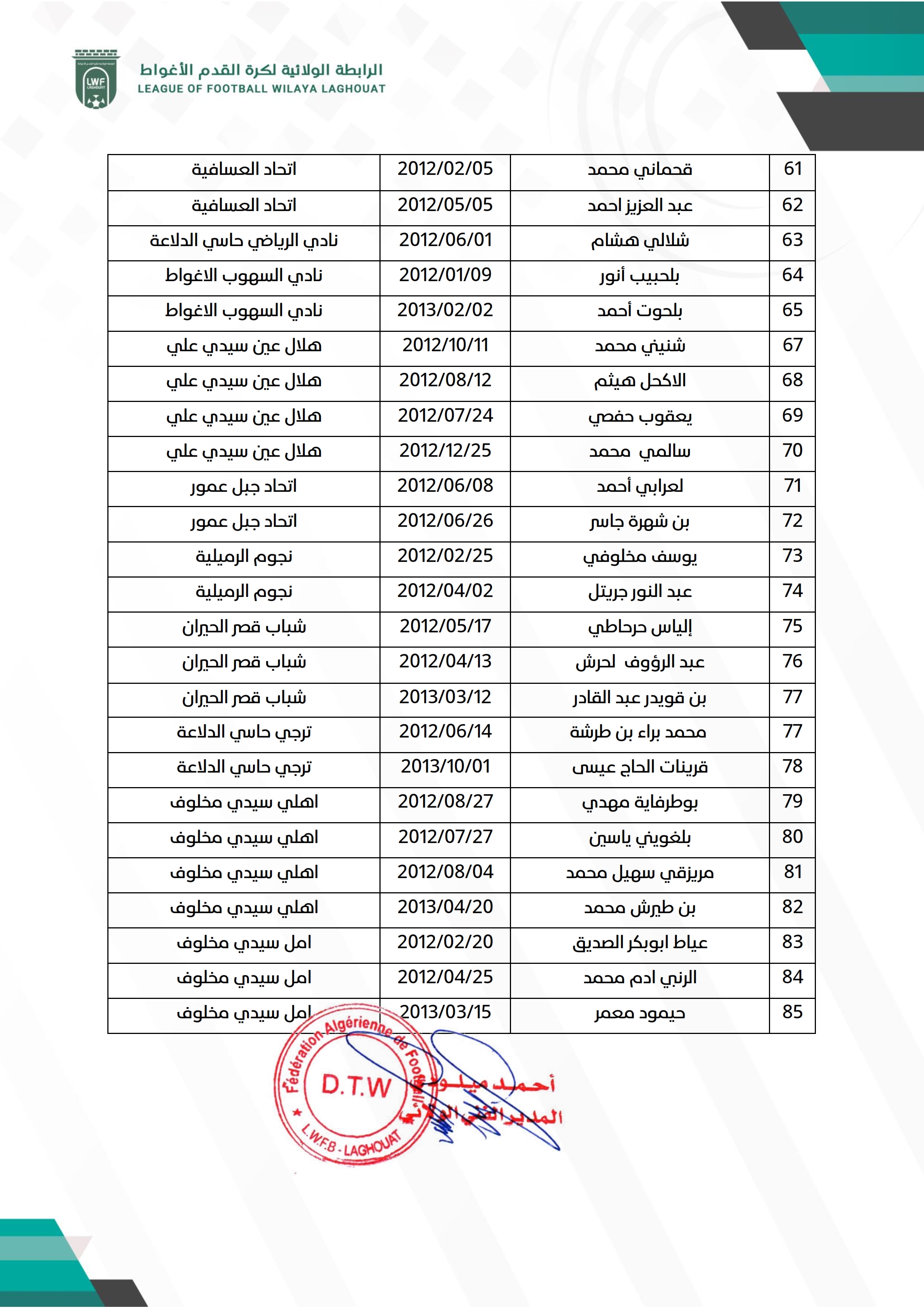 تبعاً لبرنامج المديرية الفنية للرابطة الجهوية لكرة القدم ورقلة فيما يخص عملية الانتقاء، تدعوا الرابطة الولائية لكرة القدم الأغواط اللاعبين المذكورين في القوائم بالأسفل الحضور إلى ملعب المركب الرياضي 18 فبراير يوم السبت 2025/12/13 ابتداءً من الساعة 08:00 صباحاً