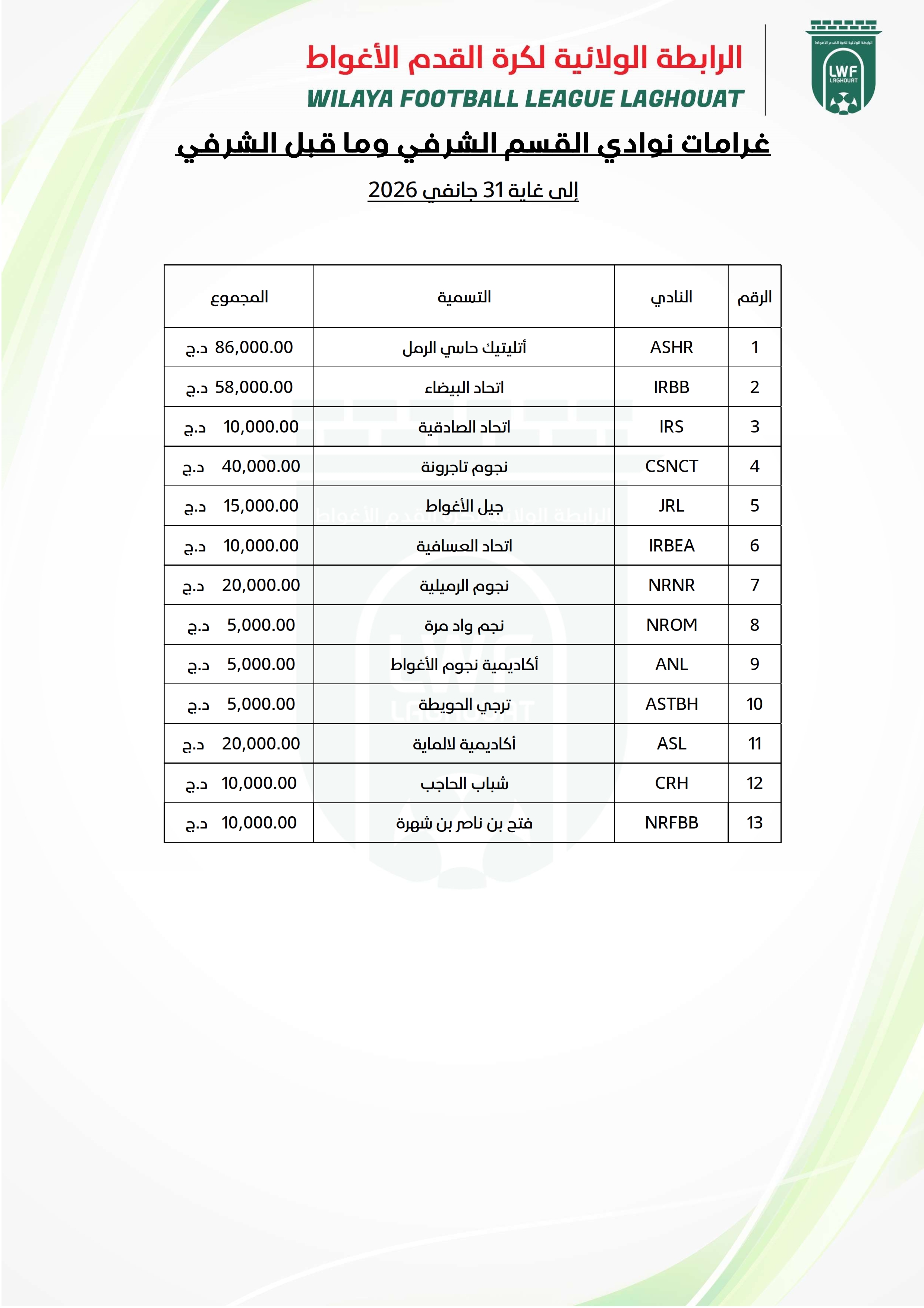 سيتم ارسال إعذارات للفرق التي لم تُسدد الغرامات المستحقة بتاريخ 01 مارس 2026