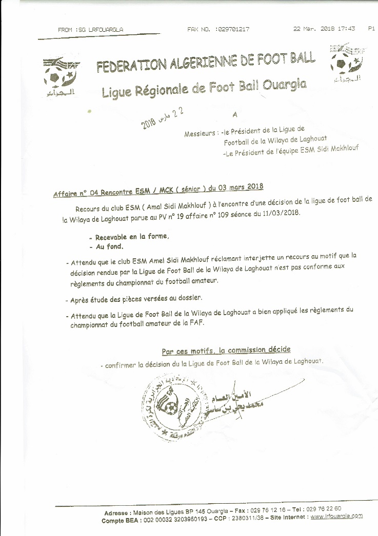 قرار لجنة الطعن للرابطة الجهوية لكرة القدم ورقلة